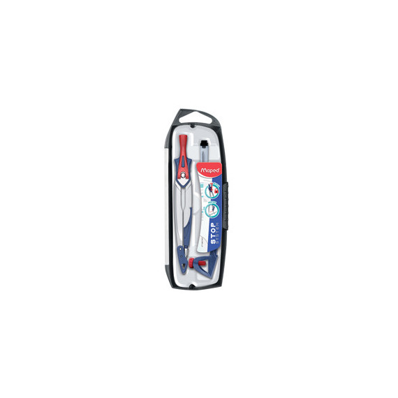 SET DA 3 PEZZI (1 COMPASSO STOP SYSTEM, 1 ADATTATORE UNIVERSALE, 1 ASTUCCIO MINE). PARTICOLARITA' DEL COMPASSO E' LA LEVA BREVETTATA PER IL BLOCCO DELLE ASTE.
