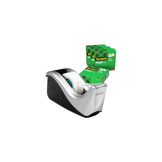 Confezione con 1 dispenser C60 colore argento e 4 rotoli Scotch Magic 810 19mm x 33mt. Comodo e compatto si adatta a qualsiasi tipo di scrivania. Sistema di cambio rotolo facile e veloce.