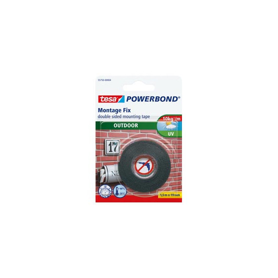 Nastro biadesivo a forte tenuta studiato specificamente per usi in esterni. Resistente a raggi UV, acqua ed escursioni termiche. Tenuta fino a 1kg per 10cm di nastro su piastrelle, mattoni, metallo, plastica ecc.