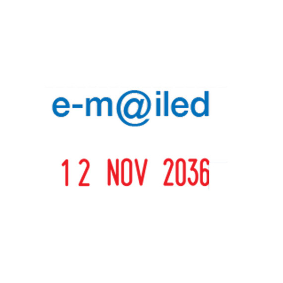 Timbro mini datario con dicitura fissa E-MAILED con caratteri alti 4mm. Fusto antiurto in ABS. Tampone preinchiostrato bicolore blu/rosso (cod 38126). Tampone ricambio nero E/10 (cod 38117).