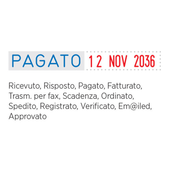 Timbro mini datario S120/WD polinomio autoinchiostrante. 12 diciture: RICEVUTO, RISPOSTO, PAGATO, FATTURATO, Trasm. Per fax, SCADENZA, ORDINATO, SPEDITO, REGISTRATO, VERIFICATO, EM@ILED, APPROVATO. Altezza caratteri 4mm. Tampone di ricambio E/12/2 (cod 48019).