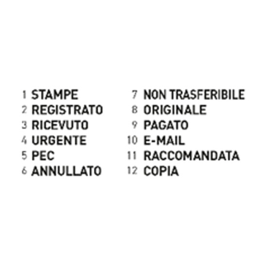 Timbro polinome con 12 diciture: STAMPE, REGISTRATO, RICEVUTO, URGENTE ,VIA AEREA, ANNULLATO, NON TRASFERIBILE, ORIGINALE, PAGATO, FAXATO, RACCOMANDATA, COPIA. Altezza carattere 4mm. tampone inchiostro 6/4911