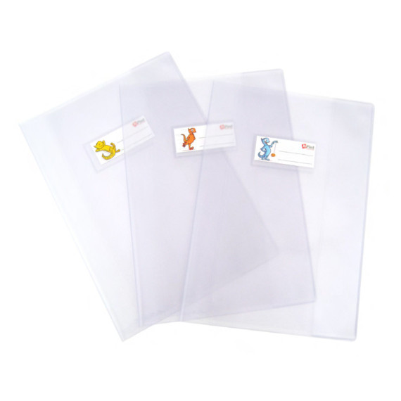 Copriquaderno in PVC trasparente goffrato effetto seta 170my, formato A5. Dotato di alette salva pagina e patelle interne in PVC 120my. Tasca porta nome personalizzabile.
