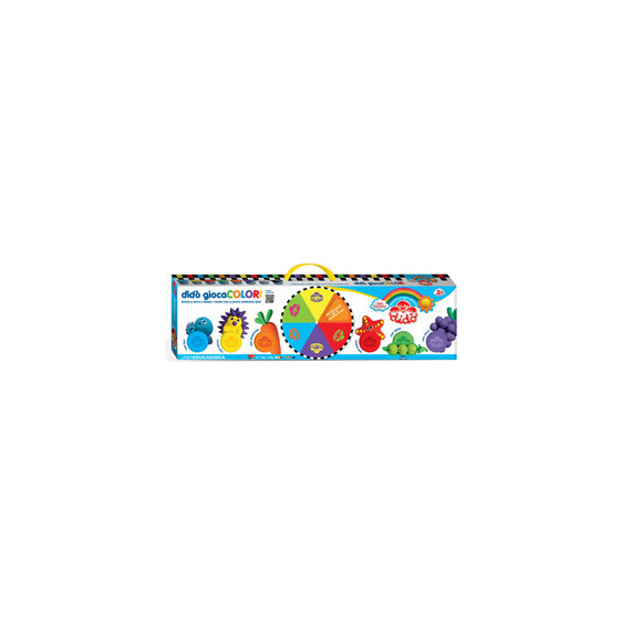 Maxi valigetta con 8 barattoli da 100gr (giallo, rosso, ciano, arancione, viola, verde, bianco e nero). 1 maxi tovaglia gioco 60x60cm, 1 mattarello, 1 coltellino, 1 ruzzola, libricino con la teoria del colore, 1 set da 3 lenti colorate, 1 set da 3 ruote colorate cambia-colore. Divertente gioco che invita a scoprire i colori e le sue alchimie.
