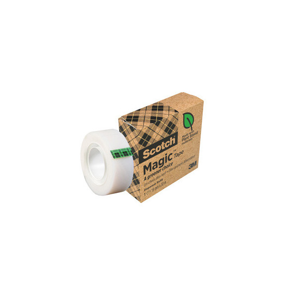 Nastro adesivo Scotch® Magic™ 900 Nastro adesivo invisibile permanente, supporto in acetato di cellulosa, adesivo di origine vegetale, anima in cartoncino riciclato al 100%, pack in cartoncino riciclato al 100%.
