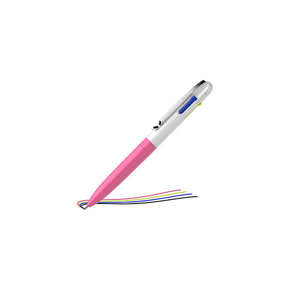 Penna a sfera a quattro colori. Scrive in nero, blu, giallo e rosa. Cambio scrittura rapido e agevole grazie ai pulsanti colorati. Realizzata per il 92% in plastica riciclata. Con tecnologia Viscoglide per una scrittura straordinariamente fluida e scorrevole. Punta M. Inchiostro indelebile conforme alla norma ISO12757-2. Dotata di robusto clip in metallo.
