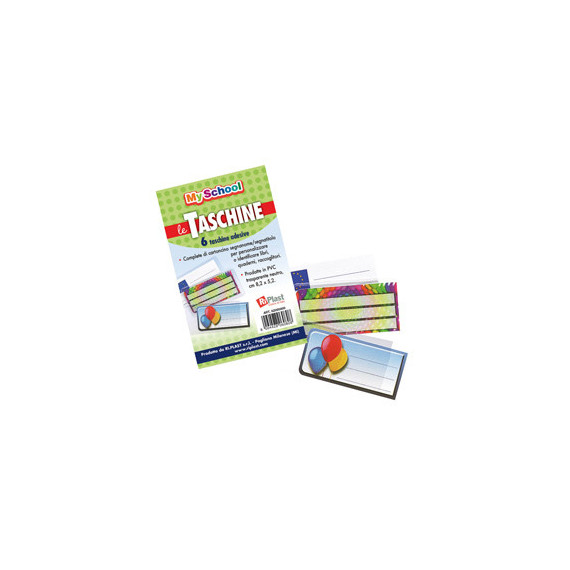 Taschine adesive complete di cartoncino segnanome per personalizzare o identificare libri, quaderni, raccoglitori. Realizzate in PVC trasparente neutro. Confezione da 6 pz.