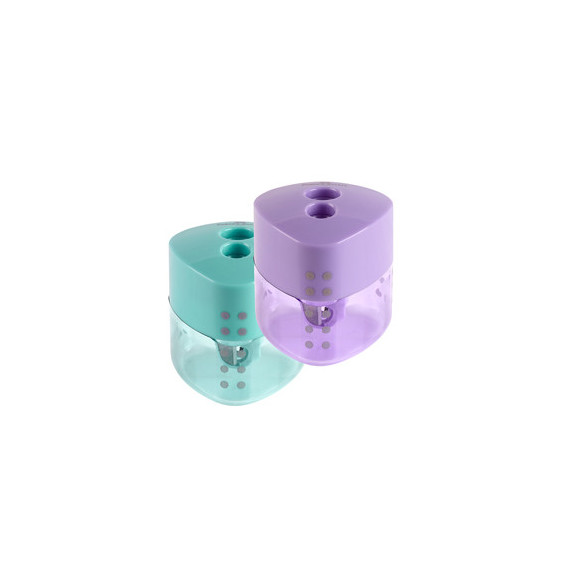 Temperamatite con serbatoio in colori assortiti viola e verde pastello. Dotato di chiusura automatica che previene la fuoriuscita dello sporco. Per tutti i formati di matite standard e jumbo.