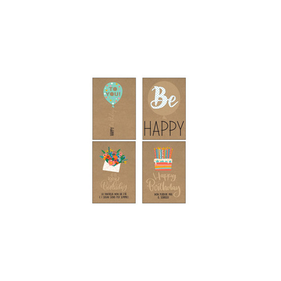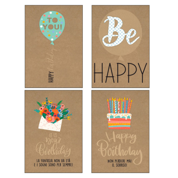 Biglietti stampati su cartoncino da 200gr con rispettiva busta in carta da 90gr. Confezionati in scatole trasparenti in PVC.