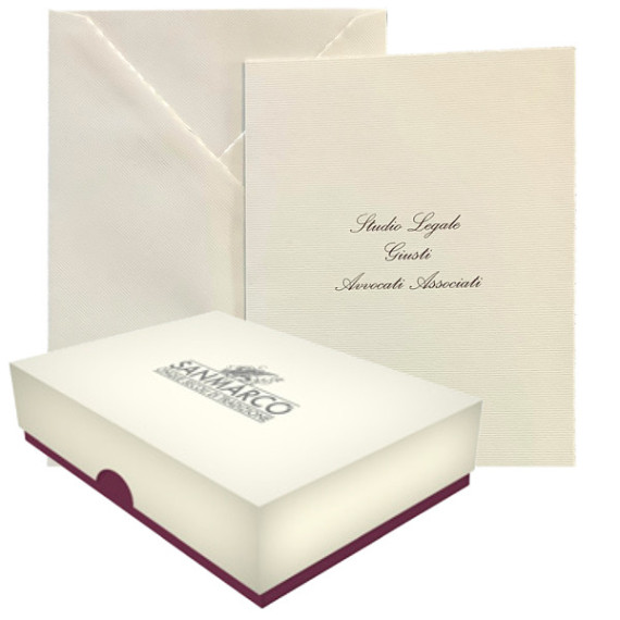 Linea classica avorio con sottile rigatura. Scatola comporta da 50 biglietti partecipazione a libro con taglio dolce color avorio martellato da 260gr formato 112x168mm. 50 buste color avorio da 120gr formato 120x175mm con patella gommata e taglio a punta.