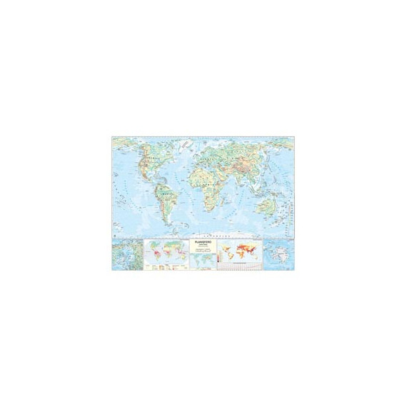 SBN: 978-88-8146-268-1Scala: 1:30.000.000Dim. chiusa: n.d.Dim. aperto: 132x99 cmRetro: Stampata su due lati (Fisico/politica)Plastificazione antiriflesso - Aste di supporto in plasticaè una carta murale di grande formato, con plastificazione opaca antiriflesso e aste in plastica. La cartografia è basata sulla proiezione tripla di Winkel e rappresenta l'aspetto fisico della terra su un lato e quello politico dall'altro. L'uso dei colori è bilanciato per salvaguardare sia la brillantezza che la leggibilità della carta. Le città si distinguono per grandezza con una simbologia appropriata e in entrambe le versioni è curata la dizione italiana dei toponimi esteri. La parte fisica è completata dai riquadri dei poli, da alcune tavole tematiche riguardanti sismicità, clima, densità di popolazione e dal grafico dell'aumento mondiale della popolazione. La parte politica mostra le bandiere del mondo con i dati essenziali di tutte le nazioni.