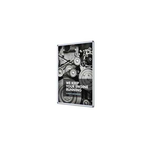 Cornici a scatto con angolo arrotondato e protezione antiriflesso in PVC. Fondo in materiale plastico PS. Tutte le cornici sono utilizzabili sia in orizzontale che verticale. Formato A3 (29,7x42cm) - profilo 25mm. Kit per fissaggio a muro non fornito.