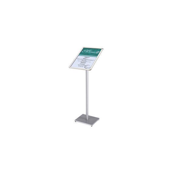 Leggio da terra con stelo in alluminio e base mdf laccata. Completo di cornice a scatto orientabile sia in orizzontale che in verticale. Ideale per presentare menu', schede informative, presentazioni ecc. altezza 120cm