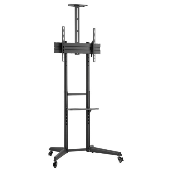 Il carrello si adatta alla maggior parte dei televisori da 37'' a 70''. Quattro impostazioni di altezza della piastra di montaggio consentono la regolazione all'altezza desiderata. La regolazione dell'inclinazione senza attrezzi fornisce l'angolo di visione ottimale. Completo di ripiano per riporre gli accessori. Mensola per webcam regolabile in altezza. Due rotelle bloccabili rendono questo carrello TV facile da spostare e fermare a piacimento.