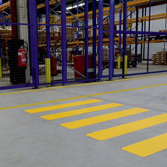 Striscia pedonale adesiva di ricambio, o per la copertura di un passaggio pedonale più largo, per uso interno. Colore giallo. Dimens ioni: 200 × 1.200 mm. Spessore: 0,5 mm.