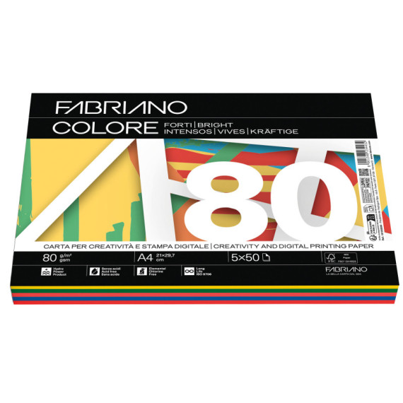 Carta Fabriano Colore - A4 - 80 gr - mix 5 colori forti - Fabriano - conf. 250 fogli