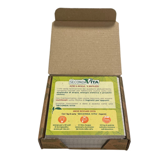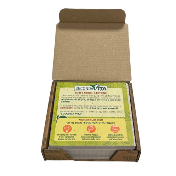 Maxiquaderno con rilegatura a punto metallico. Carta da 80 gr/mq. Copertina in cartoncino da 240 gr/mq. Prodotto totalmente in carta riciclata - Totalmente privo di plastica - 100% riciclabile. 20 fogli (80 facciate scrivibili) + risguardo. Confezione in cartone privo di plastica contenente 12 maxiquaderni rigatura 4M+ 6 scatoline di foglietti per appunti in omaggio (carta proveniente da rifili di lavorazione). Una linea di prodotti ecologici ad altissima grado di sostenibilità. Prodotti con energia solare.