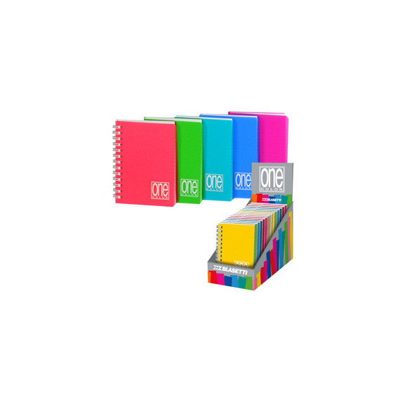 Miniquaderno spiralato sul lato lungo. Formato 8x12cm. 80 fogli (160 facciate scrivibili). Carta da 80 gr/mq. Doppia copertina in polipropilene nei colori assortiti One Color. Spirale wire-o. Display da banco contenente 14 pezzi.