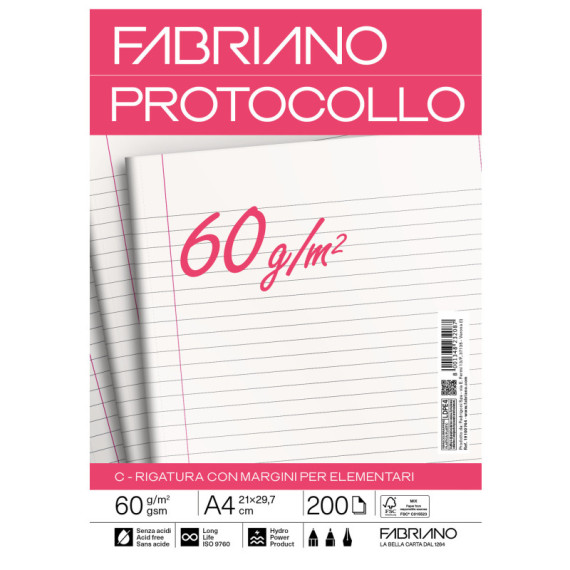 Foglio protocollo - A4 - 1 rigo c/margine - 60 gr - Fabriano - conf. 200 pezzi