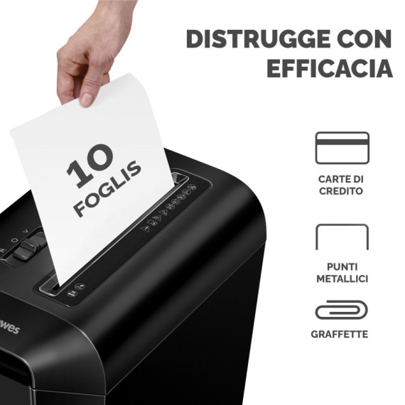 Distruggidocumenti LX65, per uso regolare a casa e in ufficio. Distrugge fino a 10 fogli in frammenti da 4x40mm (Livello DIN P-4) La tecnologia brevettata SafeSense ferma la distruzione se le mani toccano l'imboccatura della carta. Distrugge ininterrottamente fino a 6 minuti seguiti da 20 minuti di raffreddamento. Cestino da 22 litri con testata sollevabile. Distrugge anche graffette, punti metallici e carte di credito. Per uso individuale. Garanzia: 2 anni machina / 5 anni lame. Dimensioni 407 x 233 x 371mm.