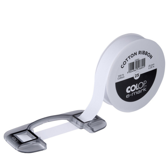 Puoi stampare con l'e-mark sui nastri in cotone, disponibili in tre formati comuni. (Nastri 10/15/25 mm.)• 100% cotone di alta qualità• Ideale per l'uso con le tre guide nastro e-mark• Dimensioni: 25 mm x 25 m• Colore: bianco