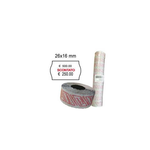 Rotolo da 1.000 etichette a onda 26x16mm con dicitura SCONTATO. Confezione 10 rotoli.