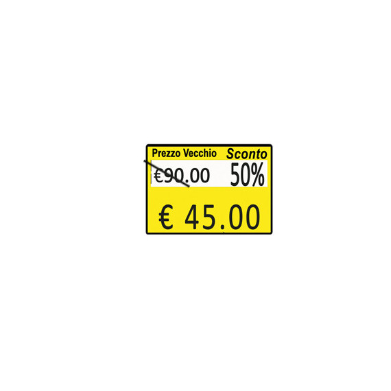Rotolo da 600 etichette rettangolari 26x19mm permanente giallo con dicitura taglio prezzo + sconto. Confezione 10 rotoli.