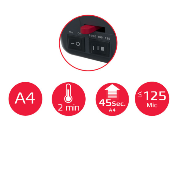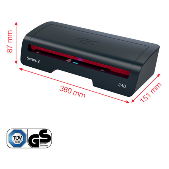 GBC 240 è una soluzione elegante ed efficiente per le esigenze di plastificazione di tutti i giorni. Questa plastificatrice A4 è ideale per l'uso a casa o in ufficio. Con un tempo di riscaldamento di 2 minuti, plastifica un foglio A4 da 75 micron in soli 45 secondi, rendendolo perfetto per gestire in modo efficiente i tuoi progetti domestici. L'interruttore di controllo, facile da usare, offre tre impostazioni di spessore della pouches da 75 a 125 micron, garantendo flessibilità per vari tipi di documenti. Una leva di sblocco anti-inceppamento assicura un funzionamento regolare. Inoltre, il sistema intelligente di LED di stato semplifica il funzionamento con chiare indicazioni visive e acustiche: rosso durante il riscaldamento, blu con un suono quando è pronto e spegnimento automatico dopo 15 minuti di inattività per risparmiare energia. Colore nero e rosso. Tempo di riscaldamento rapido, pronto all'uso in soli 2 minuti. Compatibile con pouches da 75 a 125 micron. Plastifica da carte d'identità a documenti in formato A4. Plastifica un documento A4 (75 mic) in soli 45 secondi. Plastifica 13 x A4 in 10 minuti. LED di stato SMART: si illumina di rosso durante il riscaldamento e diventa blu con un segnale acustico quando la plastificatrice è pronta all'uso. Include una confezione iniziale di 5x pouches A4 (75 micron). Basso livello di rumore <(> <<)>50Dba per ridurre le distrazioni. Certificato CE, TUV/GS.