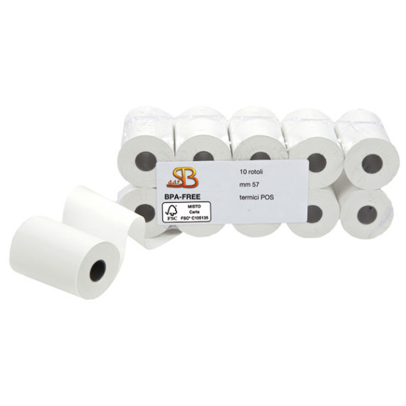 Rotoli in carta termica 55gr/m2 per POS e Carte di Credito. Stampa sul retro della dicitura non vale come scontrino fiscale + BPA free + logo FSC.Tipo carta: termica Mitsubishi P5046 priva di bisfenolo A (BPA FREE), stabilità immagine 10 anni, certificata FSC.Larghezza 57 mm. Lunghezza 20 mt (+/-1%). Diametro esterno rotolo 40 mm. Anima 12 mm. Grammatura 55g/m2 (+/-3%).