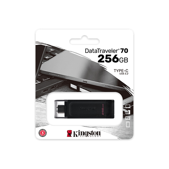 Kingston’s DataTraveler® 70 è un drive Flash USB-C1 leggero e portatile, conforme allo standard USB 3.2 Gen 1. Il drive è progettato per l’impiego con dispositivi USB-C compatibili, come notebook, laptop, tablet e smartphone. Con capacità fino a 256GB2, DataTraveler 70 offre tutta la capacità necessaria ad espandere lo storage per le attività quotidiane. Il dispositivo include una garanzia di 5 anni e un servizio di supporto tecnico gratuito.