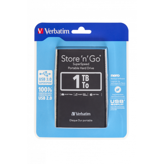 Le unità disco rigido Store n Go di Verbatim offrono elevate prestazioni per l'archiviazione grazie a un'interfaccia USB 3.0 “Superspeed”. Lo standard USB 3.0 è in grado di garantire velocità di trasferimento fino a 10 volte superiori all'interfaccia USB 2.0 (considerando la velocità del bus USB), offrendo una migrazione dei dati estremamente rapida, ovunque.