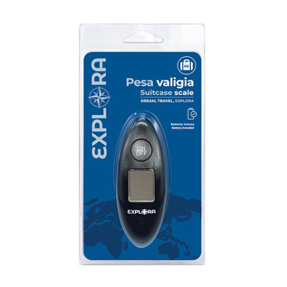 Bilancia portatile per valigie. Portata fino a 40kg, precisione 10gr. Lettura elettronica e spegnimento automatico. Avviso di sovraccarico EER. Batteria inclusa.