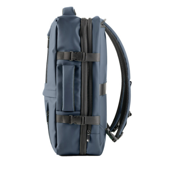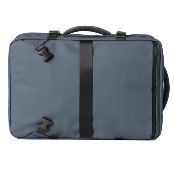 Zaino in gomma antipioggia. Tre tasche frontali portachiavi e accessori. Grande vano centrale con separatore in rete, tasca posteriore con porta notebook imbottito 15”. Vano posteriore con tracolle imbottite estraibili, schienale dotato di nastro per trolley. Doppia maniglia imbottita per trasporto e cinghie laterali per compressione. Bagaglio a mano approvato EasyJet.