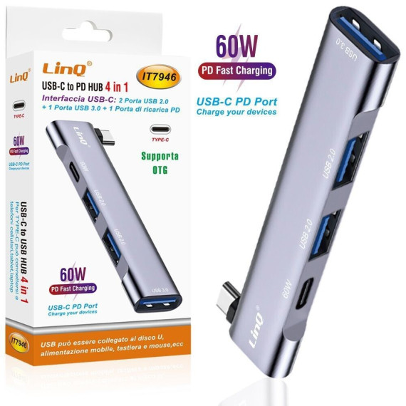 Hub Linq IT7946 type-c con 4 porte usb - 1 USB 3.0, 2 USB 2.0,1 Type-C PD 60w, ricarica rapida PD fino a 60W, Funzione OTG