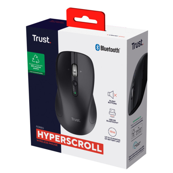 Mouse wireless con hyperscroll e connessione a tre dispositivi via Bletooth e ricevitore USB.Sensore ottico regolabile da 1000 a 3200 DPI ,pulsanti silenziosi e design confortevole.Realizzato con l'85% di plastica riciclata,offe fino a 19 mesi di autonomia.