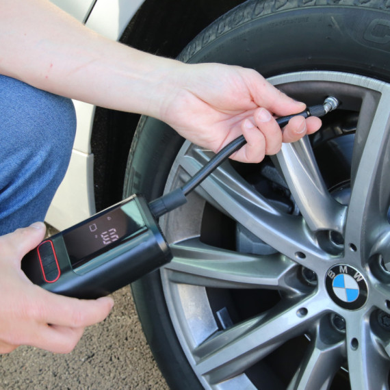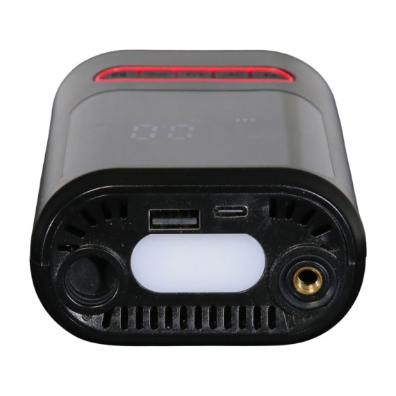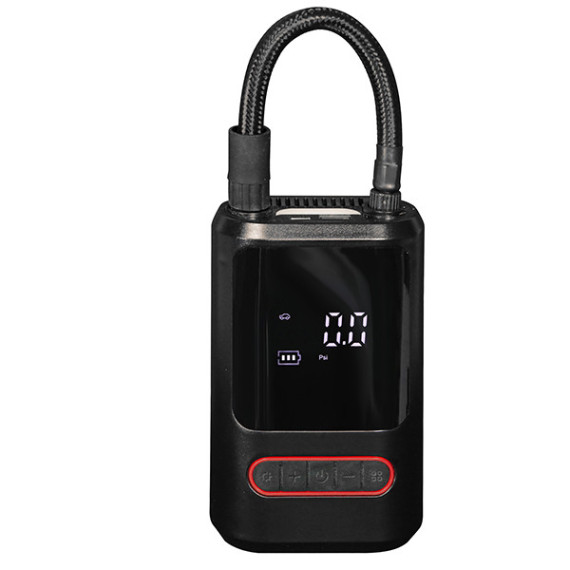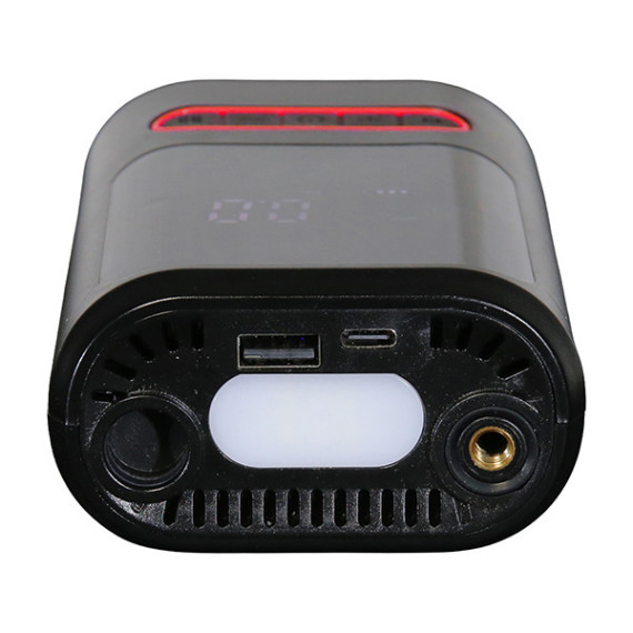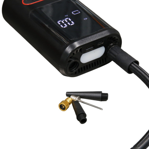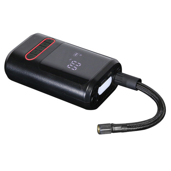 Mini compressore con pressione massima, impostabile da display digitale, fino a 8bar. Luce led con 3 funzioni. Funzione power bank. Batteria ricaricabile 18V da 2Ah. Spegnimento automatico. Fornito di 3 differenti ugelli per il gonfiaggio, tubo di gonfiaggio e cavo di ricarica USB type-C.
