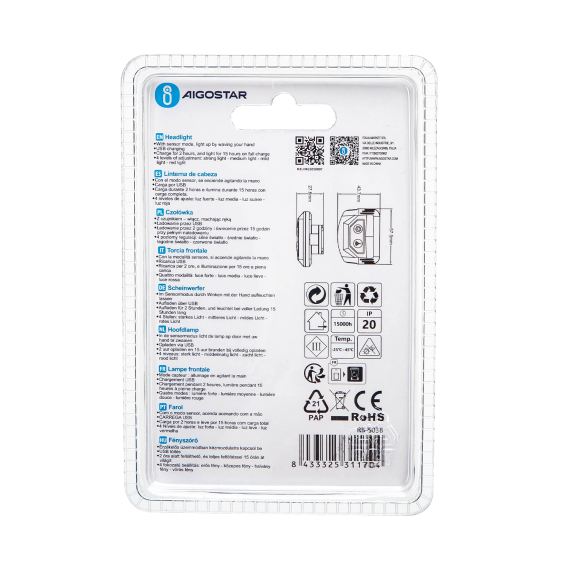 Torcia lampada da testa led frontale con interruttore a sensore ricarica type-c Aigostar 1.11w 80 lumen 6500k luce fredda Dimensioni:L58xW44xH27mm ip44