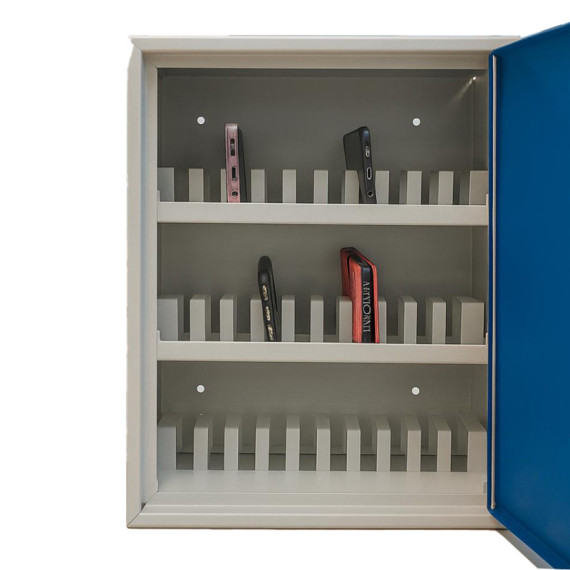 Armadietto portacellulare con 30 vani in robusto metallo che risponde alla richiesta delle scuole a seguito della Circolare Ministeriale n. 3392 del 16 giugno 2025 che vieta l’uso dei cellulari. Dotata di viti e bulloni per affissione al muro. Materiale corpo : Lamiera lucida. Vernice: Polvere epoxy poliestere (formulata con pigmentoesente da cromo e piombo da società certificata iqnet-certichim). Serratura a chiave modello eurolock (belgio) con nr. 2chiavi duplicabili. Dimensioni: 30x23x40cm. Peso: 6kg.
