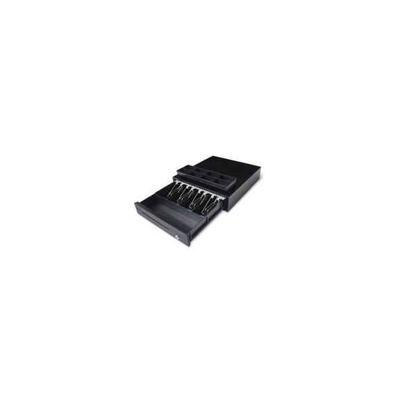Cassetto portadenaro composto da 4 cassetti fi ssi per banconote con molle fermacarte in metallo, 8 vaschette removibili per monete e fessura frontale per inserimento banconote in vano nascosto. Dotato di cavo Epson RJ11. Apertura manuale con chiave oppure apertura elettrica con cavo connesso al terminale. Dimensioni: 350x405x90.- 4 cassetti fissi per banconote con molle fermacarte in metallo- 8 vaschette removibili per monete- Apertura manuale con chiave oppure apertura elettrica con cavo connesso al terminale- Cavo collegamento Epson RJ11 incluso (12 volt)- Fessura frontale per inserimento banconote in vano nascosto- Colore nero- Dimensioni mm. 350x405x90- Peso netto kg. 4,6