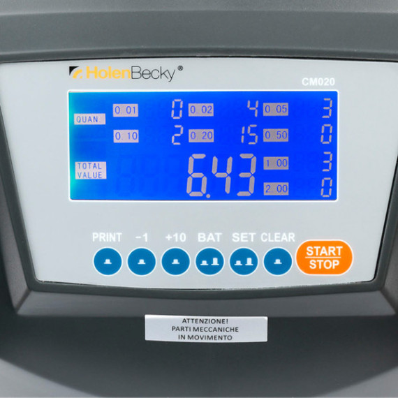 Conta-divide monete Euro in 8 cassetti,silenziosa e veloce, con display LCD di ultima generazione. Dotata di funzione batch memorizzabile e dell'innovativa funzione REPORT di conteggio a display. Permette di effettuare la stampa del report tramite stampante dedicata (cod.87185). Capacità di carico 300/500 monete. Capacità dei cassetti 180/230 monete. Velocità di conta 215 monete/minuto. Display digitale LCD (retroilluminato blu). Alimentazione AC 220V 50Hz. Dimensioni mm. 321 (D) x 270 (H). Peso kg. 4,50