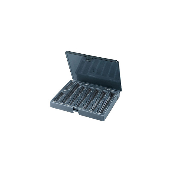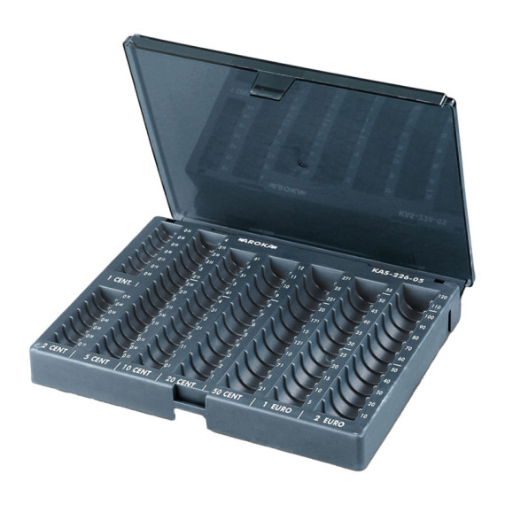 Vaschetta portamonete in polistirolo antiurto con coperchio trasparente amovibile. Colore grigio scuro. Dimensioni: 23,5x18,5x3,5cm