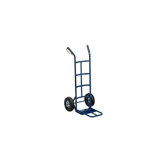 Carrello in acciaio verniciato di colore blu, manopole con paracolpi, completo di ruote pneumatiche. Portata massima: 250kg. Dimensioni: 116x55x68cm. Ruota di ricambio: 91874. Pedana ribaltabile.Articolo destinato ad esclusivo uso domestico. Non adatto ad uso pubblico.