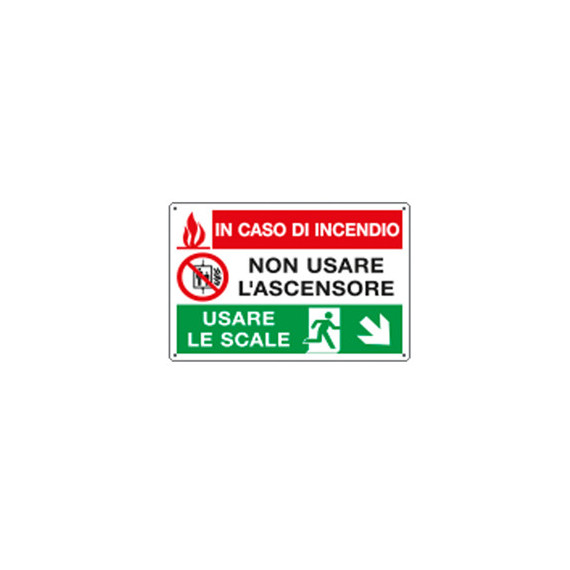 Targhetta adesiva multisimbolo - 30x20 cm - IN CASO DI INCENDIO…DISCESA DX - Cartelli Segnalatori