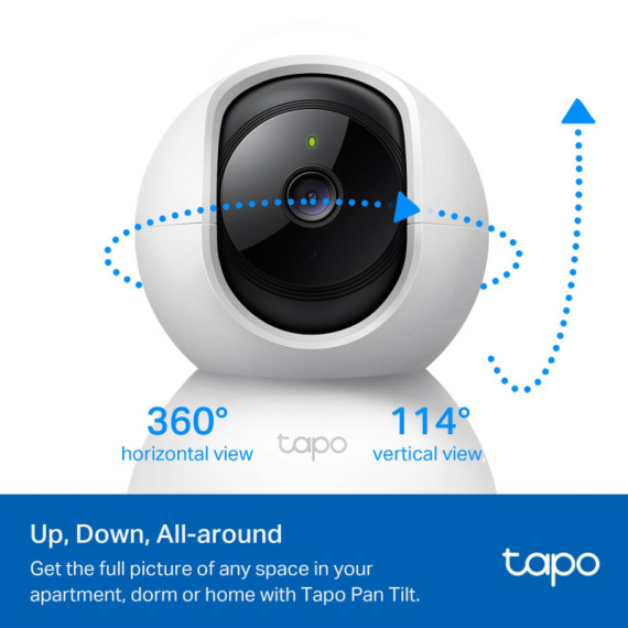 Telecamera ad alta definizione 1080p con rotazione orizzontale a 360° e verticale a 114° e visione notturna LED IR 850 nm fino a 30 ft. Audio bidirezionale, visualizzazione live e modalità privacy che disattiva la sorveglianza. La telecamera memorizza a 128 GB su una scheda microSD, equivalenti a 384 ore (16 giorni) di registrazioni. La confezione contiene: Telecamera TC70, alimentatore, guida rapida, base per la telecamera, viti di montaggio. Alimentazione: 100–240VAC, 50/60Hz. Dimensioni 85,4x86,8x117,7mm.