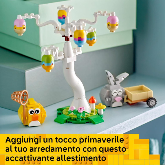 Il set offre un’esperienza di costruzione che ispira la creatività, con un coniglio, un uccello, un albero e 6 uova.