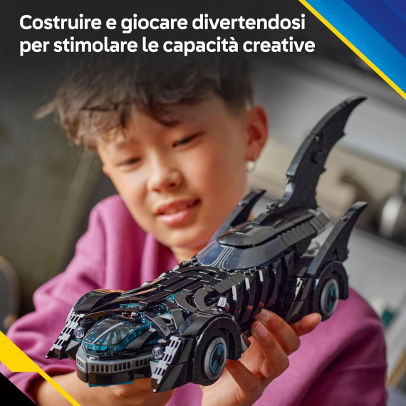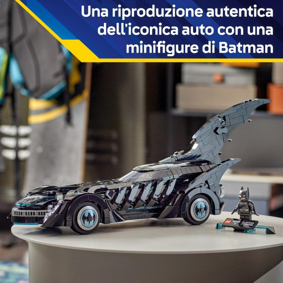 Questa autentica ricostruzione dell’iconica auto del film Batman Forever è dotata di parabrezza sagomato, ruote mobili, decorazioni e un abitacolo che si apre per rivelare un interno dettagliato. Il veicolo è dotato anche di una minifigure di Batman con il suo supporto speciale. Per tanto divertimento digitale in più, i costruttori possono ingrandire, ruotare i modelli in 3D e seguire i loro progressi utilizzando l’intuitiva app LEGO Builder. Contiene 909 pezzi.