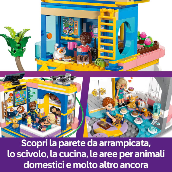 Lascia correre l’immaginazione mentre i bambini dagli 8 anni in su esplorano il set giocattolo Casa dell’amicizia di Heartlake City LEGO® Friends (42689). I bambini e le bambine possono creare missioni segrete e storie infinite con questo set per bambini. Tante avventure ti attendono sulla teleferica, sullo scivolo e sulla parete da arrampicata. Risolvi un mistero usando il computer nascosto e il drone. Prenditi cura degli animali domestici, mettiti a dipingere al cavalletto o fai spuntini in cucina. Qualunque sia la loro passione, i bambini possono esplorarla qui! Questo set costruibile contiene 5 mini-doll, più un gatto, un geco e un coniglietto. Ci sono anche tanti accessori per stimolare l’immaginazione dei bambini, tra cui ciotole per animali e acqua, una macchina per popcorn, una TV da gaming con controller, un frigorifero, ciambelle, fragole, cialde e altro ancora. Questo kit di costruzione per bambini è un regalo divertente per i bambini e le bambine che amano i giocattoli ele attività creative. Amici e familiari possono collaborare con la modalità Build Together nell’app LEGO Builder, dove tutti si divertono a costruire parte del set utilizzando i propri dispositivi. Il set contiene 794 pezzi.