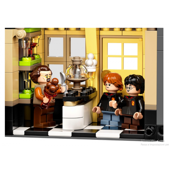 Questo imponente modello, di oltre un metro di larghezza, riproduce l'atmosfera dell'animata strada su cui si affacciano negozi che vendono forniture per maghi. Dietro magnifiche facciate si nascondono interni misteriosi, funzioni affascinanti e personaggi familiari. Esamina le bacchette da Ollivander, entra nella libreria Il Ghirigoro per iscriverti a un evento firmacopie di Gilderoy Lockhart™, acquista una pozione d’amore nel Tiri vispi Weasley e scopri i prodotti e gli articoli in vendita nella cartoleria Scribbulus™, da Accessori di Prima Qualità per il Quidditch™ e nella Gelateria Fortebraccio, oltre ad ammirare l'ingresso della Gazzetta del profeta.