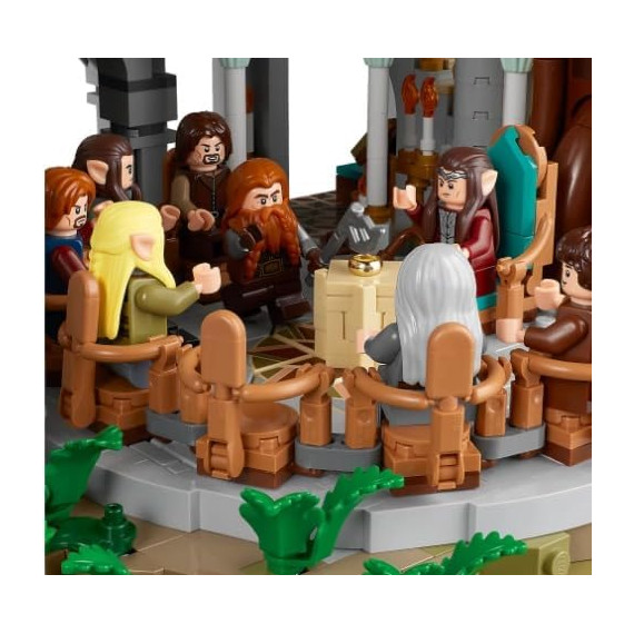 Il set da costruzione è decorato con fogliame che dà la sensazione di trovarsi nel profondo della foresta di Gran Burrone e include dettagli magici come la fucina degli elfi, il disordinato studio di Elrond, i Frammenti di Narsil, oltre a dipinti e statue della storia della Terra di Mezzo. Il set comprende anche 15 minifigure per dare vita alle tue scene preferite. Le minifigure sono dotate di gambe rimovibili in modo da poterle disporre intorno alla tavola per ricreare la famosa scena del Consiglio di Elrond.