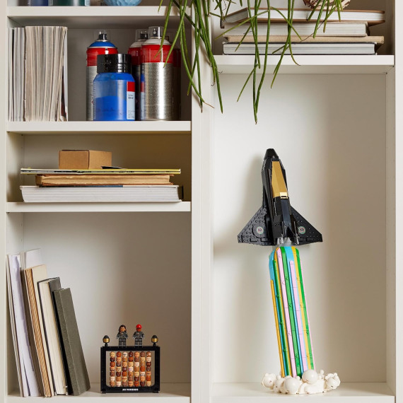 Il modellino dello Space Shuttle è dotato di cabina di pilotaggio apribile e di carrello di atterraggio agganciabile, che può essere montato quando il veicolo è staccato dalla scia colorata, che funge da espositore. Ognuna delle 2 minifigure è dotata di tuta spaziale color titanio con dettagli stampati, più un casco spaziale con visiera color oro apribile.